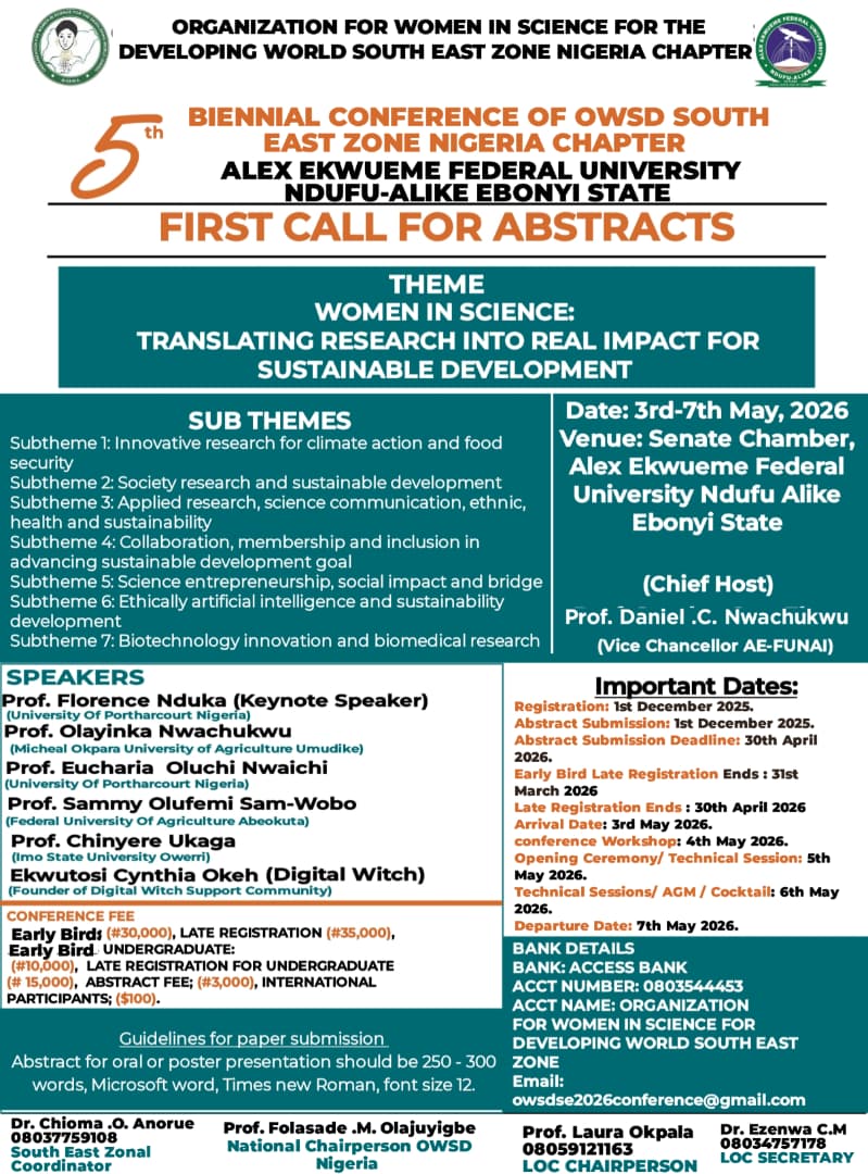 The Organization for Women in Science for the Developing World (OWSD), Nigeria, South East Zone, is pleased to announce its 5th Biennial Conference, scheduled to hold from 3rd to 7th May, 2026 at the Senate Chamber, Alex Ekwueme Federal University, Ndufu-Alike (AE-FUNAI), Ebonyi State, Nigeria. This prestigious conference is organized under the theme: “Women in Science: Translating Research into Real Impact for Sustainable Development.” The event serves as a major platform for women scientists, researchers, innovators, educators, students, development partners, and stakeholders to engage in meaningful discussions on how scientific research can be transformed into practical solutions that address societal challenges and advance sustainable development goals (SDGs). The conference will feature keynote addresses, technical paper presentations, panel discussions, workshops, networking sessions, and an Annual General Meeting (AGM). Participants will explore critical sub-themes such as climate action and food security, applied research and ethics, science communication, biotechnology innovation, artificial intelligence for sustainability, entrepreneurship, inclusion, and social impact. The OWSD Biennial Conference is designed to strengthen collaboration among women in STEM, encourage mentorship, promote impactful research translation, and inspire innovative approaches to national and global development challenges. Researchers and students are invited to submit abstracts (250–300 words) for oral or poster presentations. The conference also provides opportunities for capacity building, visibility, and partnership development across academia, industry, and policy spaces.