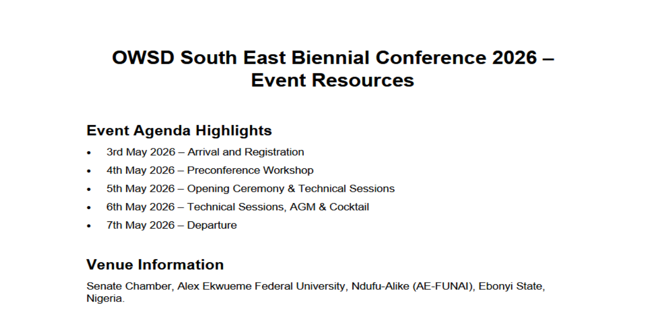 The Organization for Women in Science for the Developing World (OWSD), South East Zone, is pleased to announce its 5th Biennial Conference, scheduled to hold from 3rd to 7th May, 2026 at the Senate Chamber, Alex Ekwueme Federal University, Ndufu-Alike (AE-FUNAI), Ebonyi State, Nigeria. This prestigious conference is organized under the theme: “Women in Science: Translating Research into Real Impact for Sustainable Development.” The event serves as a major platform for women scientists, researchers, innovators, educators, students, development partners, and stakeholders to engage in meaningful discussions on how scientific research can be transformed into practical solutions that address societal challenges and advance sustainable development goals (SDGs). The conference will feature keynote addresses, technical paper presentations, panel discussions, workshops, networking sessions, and an Annual General Meeting (AGM). Participants will explore critical sub-themes such as climate action and food security, applied research and ethics, science communication, biotechnology innovation, artificial intelligence for sustainability, entrepreneurship, inclusion, and social impact. The OWSD Biennial Conference is designed to strengthen collaboration among women in STEM, encourage mentorship, promote impactful research translation, and inspire innovative approaches to national and global development challenges. Researchers and students are invited to submit abstracts (250–300 words) for oral or poster presentations. The conference also provides opportunities for capacity building, visibility, and partnership development across academia, industry, and policy spaces.