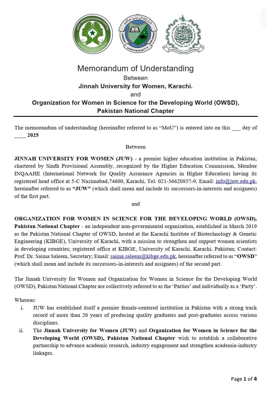The OWSD – Pakistan National Chapter (PNC) has signed a Memorandum of Understanding (MoU) with Jinnah University for Women (JUW), Karachi, marking an important step toward strengthening collaboration for the advancement of women in science and academia.