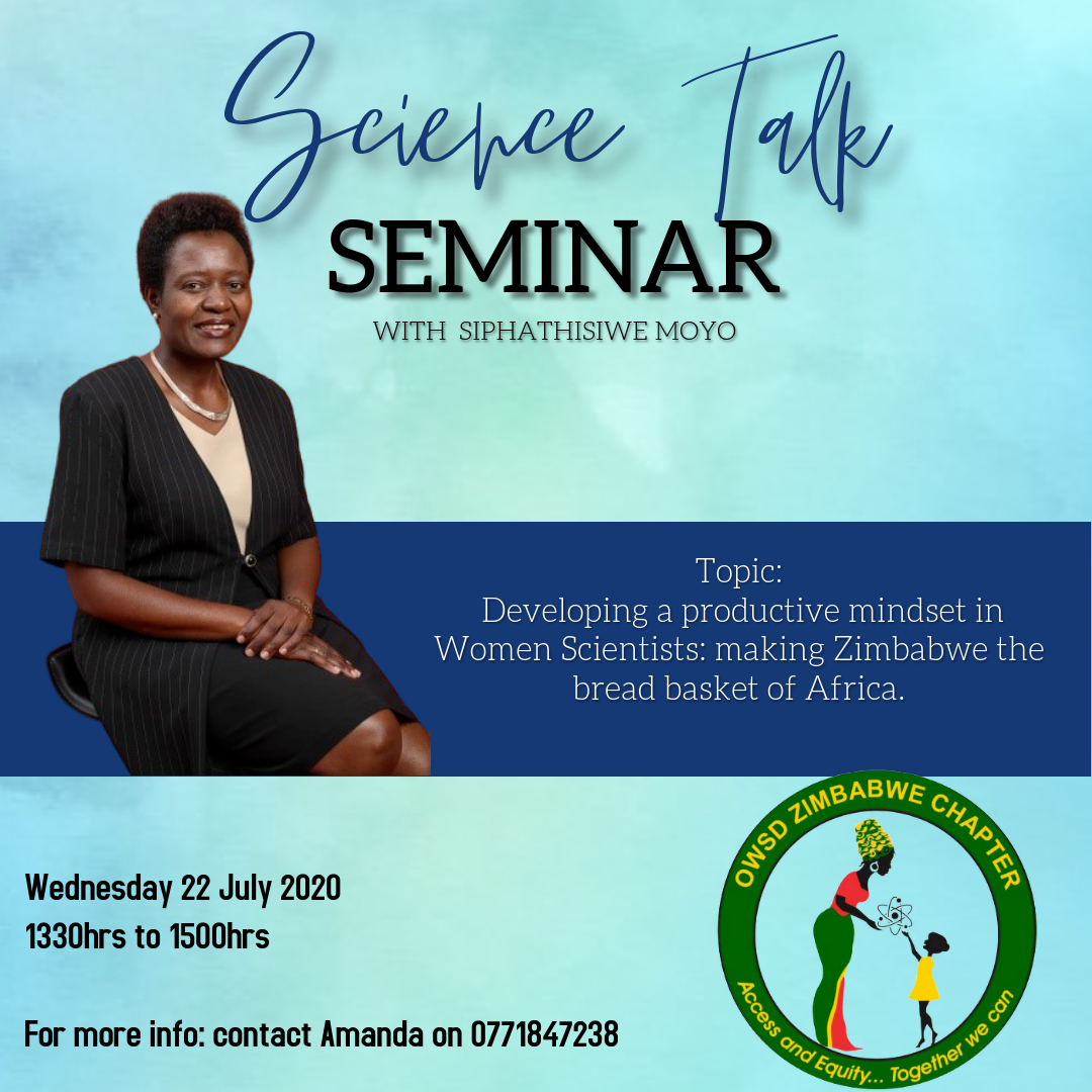 The OWSD Zimbabwe National Chapter are holding an event via WhatsApp titled "Developing a productive mindset in Women Scientists: making Zimbabwe the bread basket of Africa", featuring guest speaker Siphathisiwe Moyo. The event will take place on 22 July, starting at 13:30 Zimbabwe time.