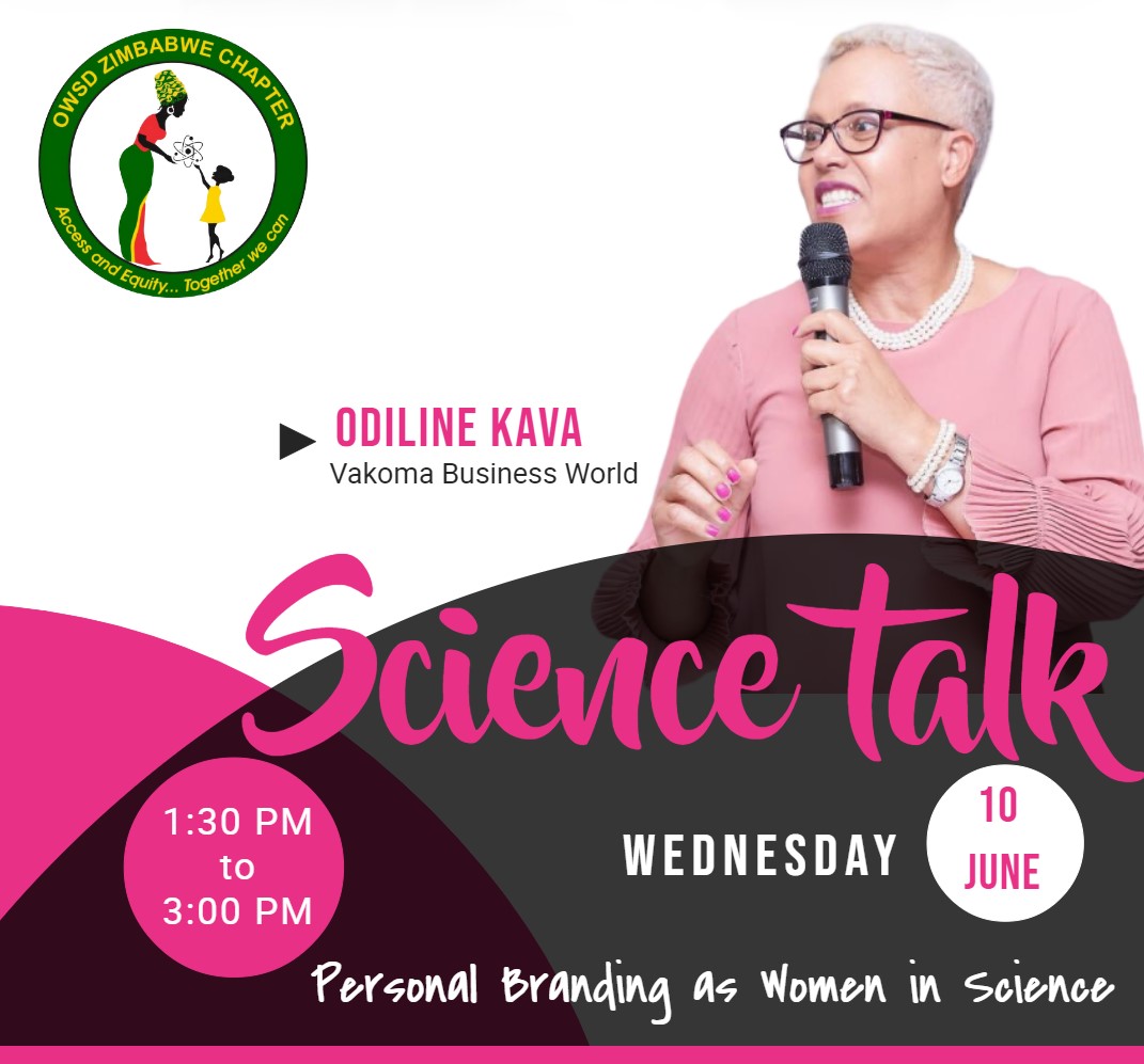 The OWSD Zimbabwe National Chapter are holding an event via WhatsApp titled "Personal Branding as Women in Science", featuring guest speaker Odiline Kava. The event will take place on Wednesday 10 June, starting at 13:30 Zimbabwe time.