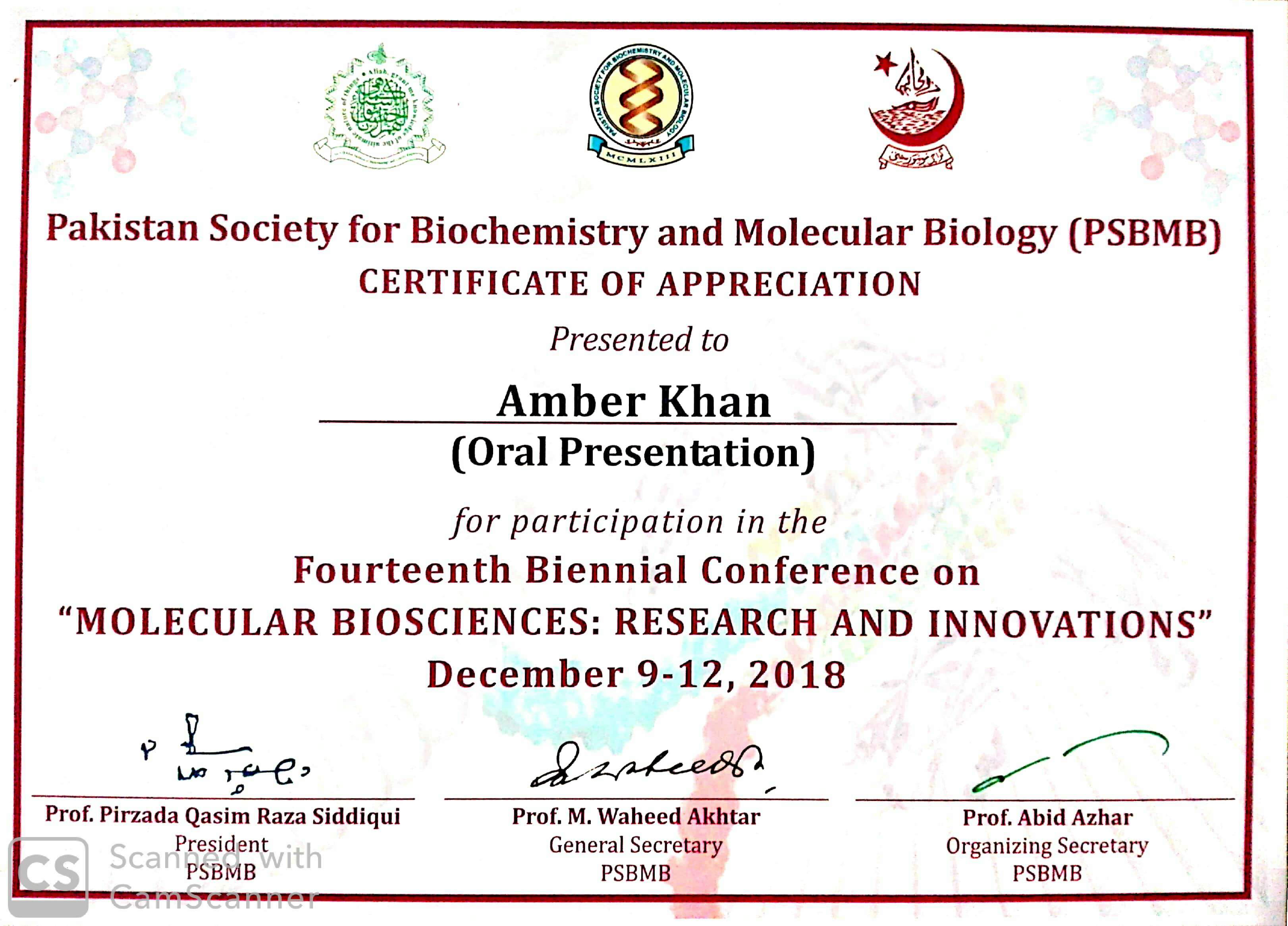 Fourteenth Biennial Conference on “Molecular Biosciences: Research and Innovations” Pakistan society for biochemistry and molecular biology (PSBMB)2019
