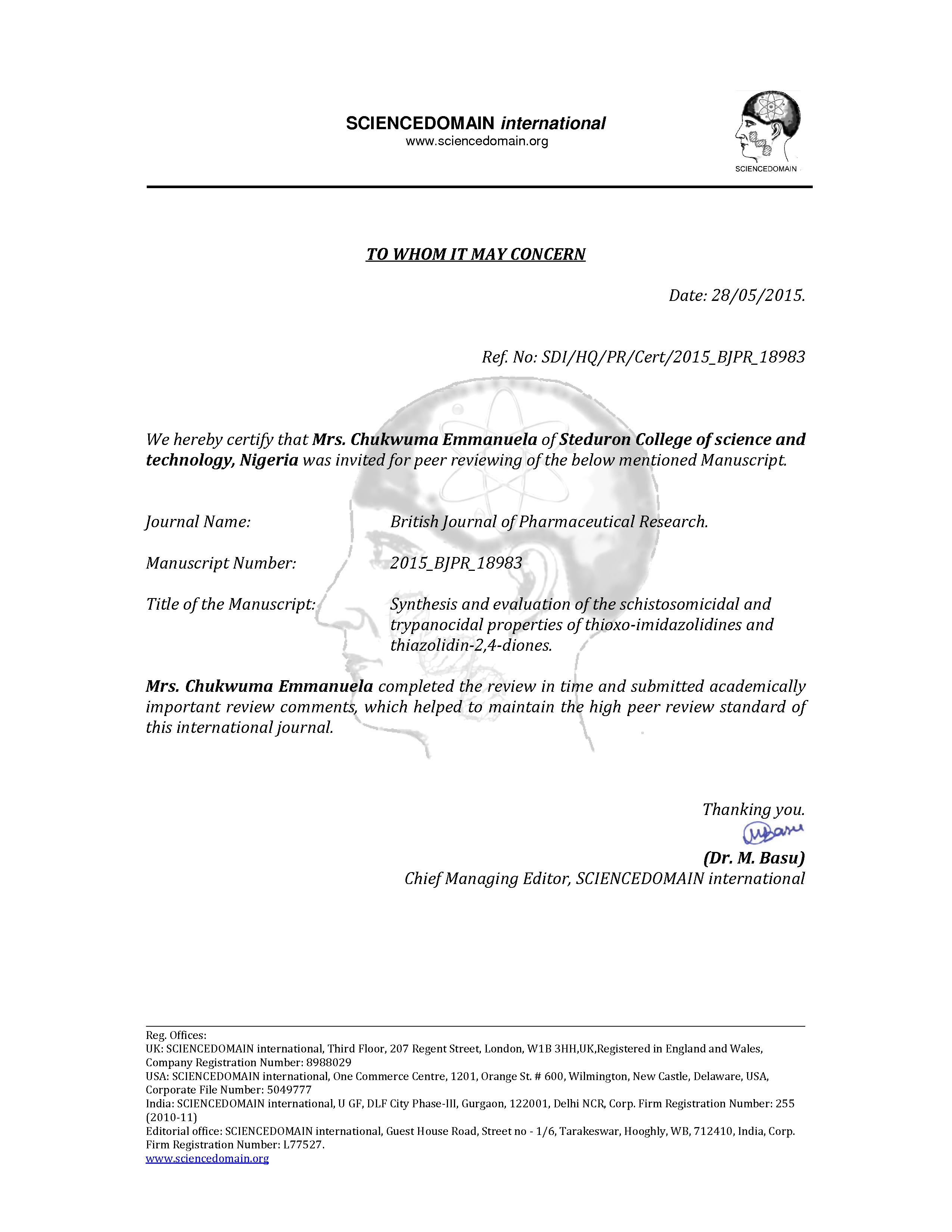 June 1998 Emmanuela Tochukwu Chukwuma > Other Awards Full Member Mrs. Emmanuela Tochukwu Chukwuma Membership since: 2015 Nigeria | Currently in: Nigeria Field of activity: Other Awards June 1998 MISS BIOSA Other Memberships/Affiliations SDI Degrees: 2013 Master Biological Systems and Organisms Publications Publications resulting from Research IBRR Talks and lectures Thesis proposal 2025 Ota. Neonatal mycoses Attached file Attend events workshop: Iloko parentise 2025 Ogun state, Nigeria Awards June 1998 MISS BIOSA