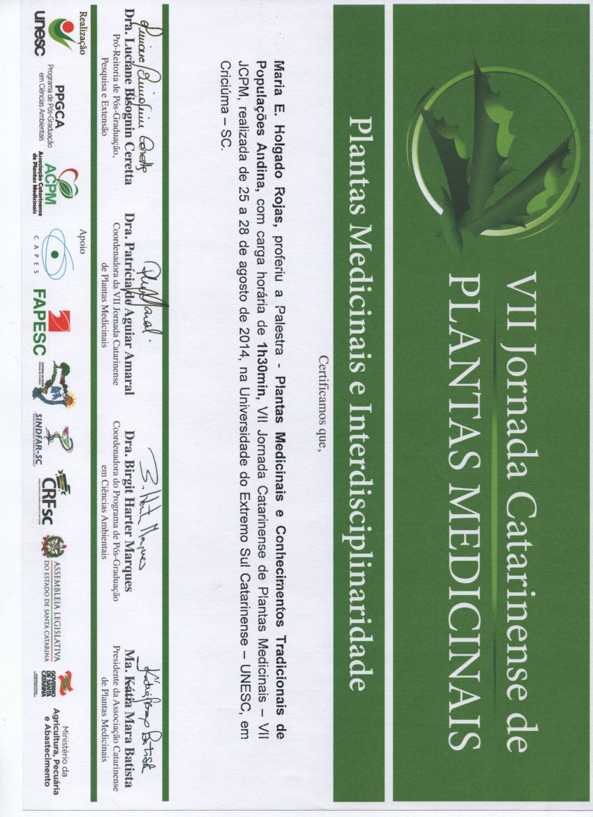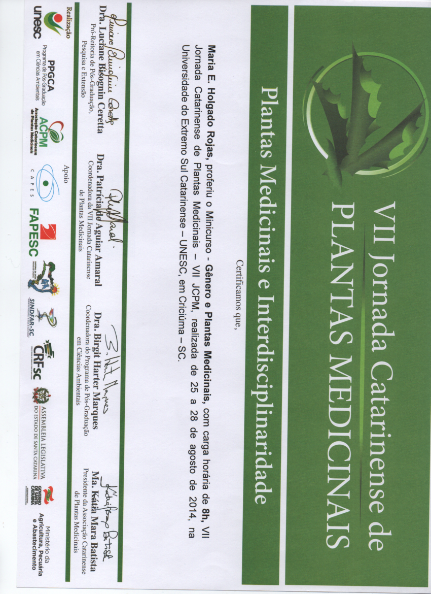 VII Jornada Catarinense de Plantas Medicinales. Universidade do Extremo Sul Catarinense, UNESC, Criciuma, SC. Brasil