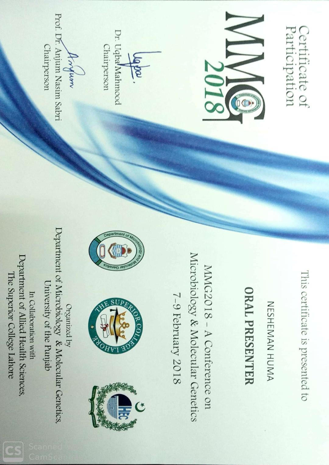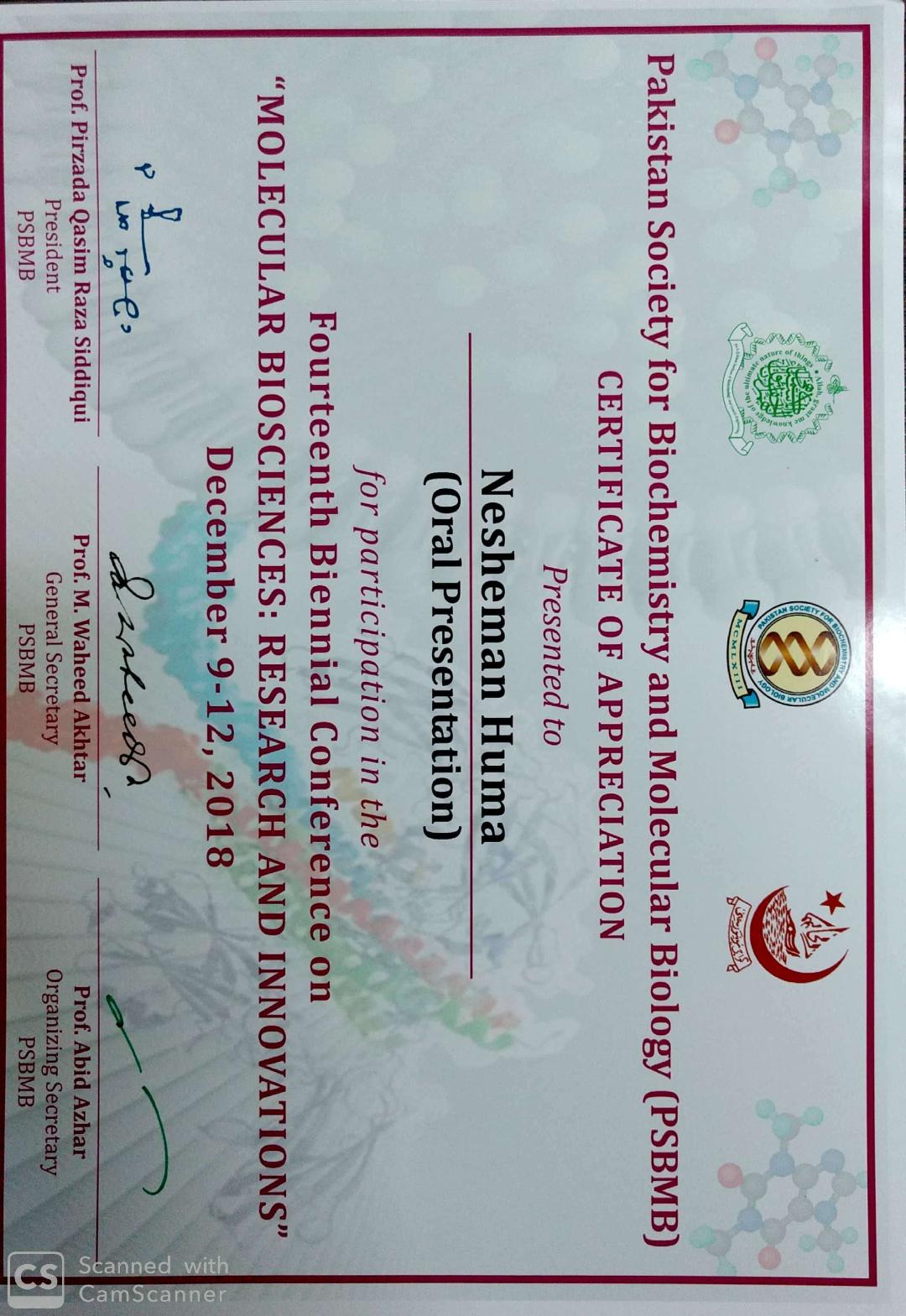 Received best poster presenter award during international conference on "Emerging Trends in Biological Sciences and Genomics” December 28-30, 2015, Jointly organized by M. A. H. Qadri Biological Research Center (BRC) & Dr. A. Q. Khan Institute of Biotechnology & Genetic Engineering (KIBGE) University of Karachi