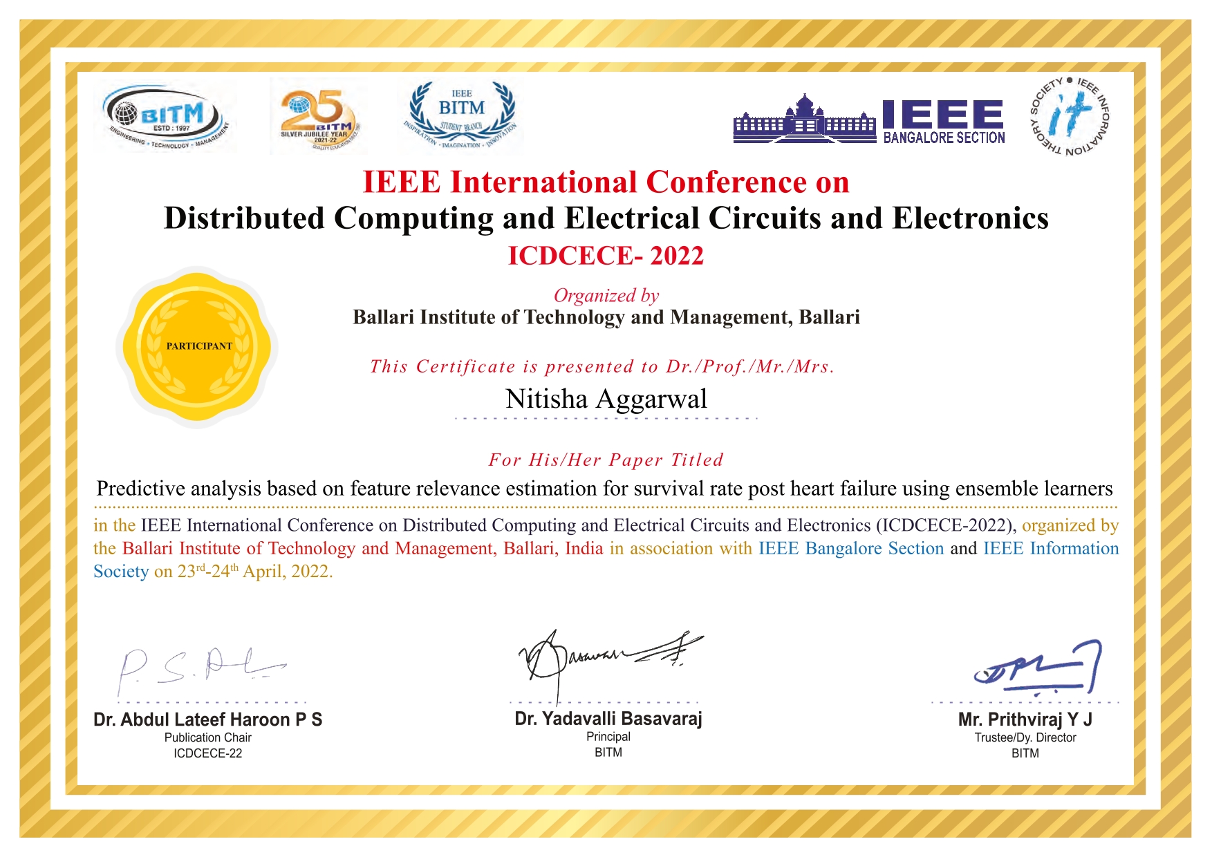 2. K. Sharma, R. Chawla, U. Shukla, N. Aggarwal, A. S. Bafila, S. Singh, A. Pundir and G. J. Saxena, "Predictive analysis based on feature relevance estimation for survival rate post heart failure using ensemble learners," presented at the ICDCECE, Ballari, Karnataka, India, April 23-24, 2022.