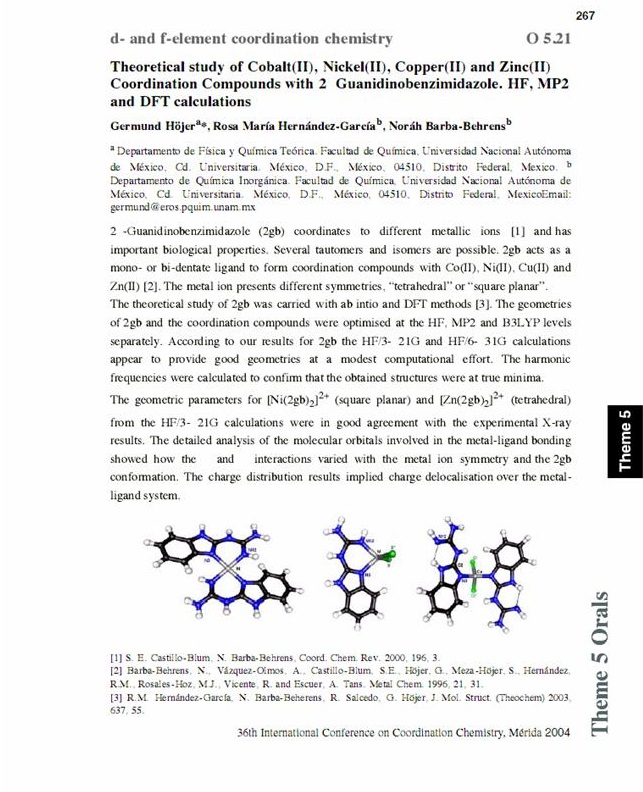Barba-Behrens, N.; Vázquez-Olmos, A.; Castillo-Blum, S.E.; Höjer, G.; Meza-Höjer, S.; Hernández, R.M.; Rosales-Hoz, M. de J.; Vicente, R.; Escuer. A. Coordination behaviour of 2-guanidinobenzimidazole towards cobalt(II), nickel(II), copper(II) and zinc(II). An experimental and theoretical study. Transition Metal Chemistry 1996, 21(1), 31-37.