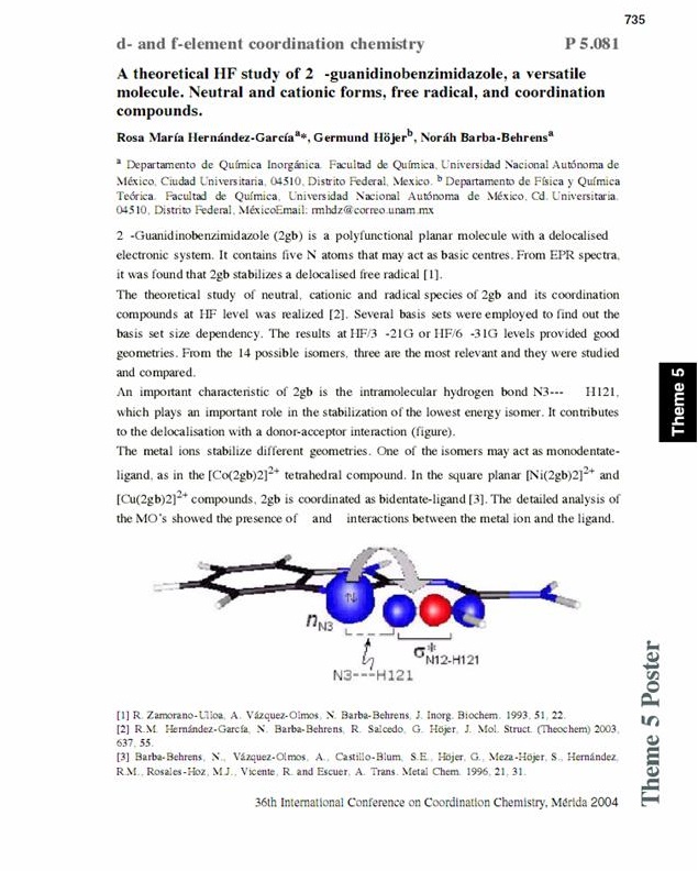 Barba-Behrens, N.Y.; Téllez, F.; Contreras, R.; Hernández, R.M.; Bernès, S.; Nöth. H. New developments on the coordination behaviour of 2-substitued bensimidazoles. Journal of Inorganic Biochemistry. 2003, 96(1), 98.