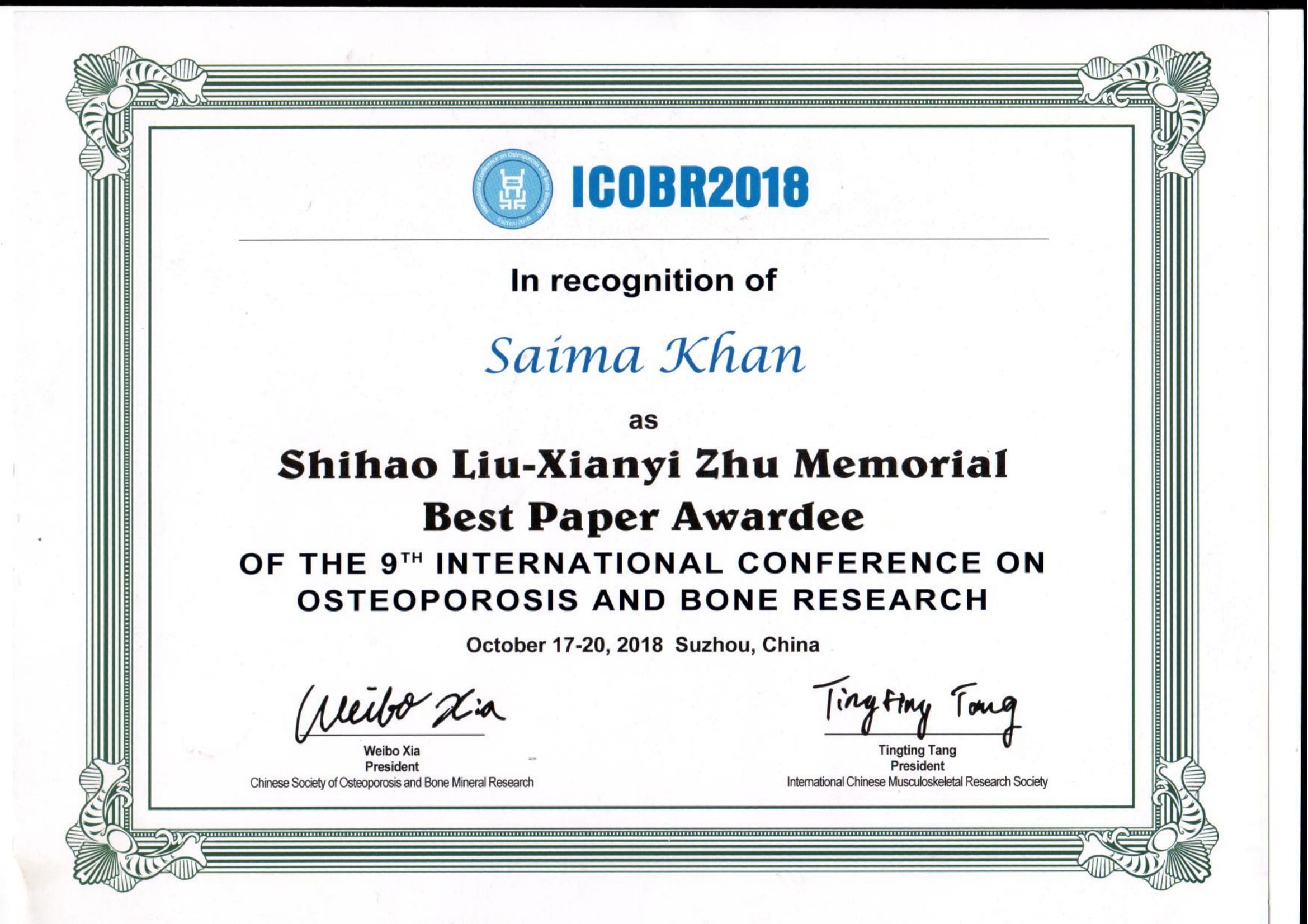 best Oral presentation 9th International Conference on Osteoporosis and Bone Mineral Research (Oct. 17-20, 2018) co-sponsored by the Chinese Medical Association, the Osteoporosis and Bone Mineral Salt Branch of the Chinese Medical Association and the International Chinese Osteoporosis Society at Suzhou-China