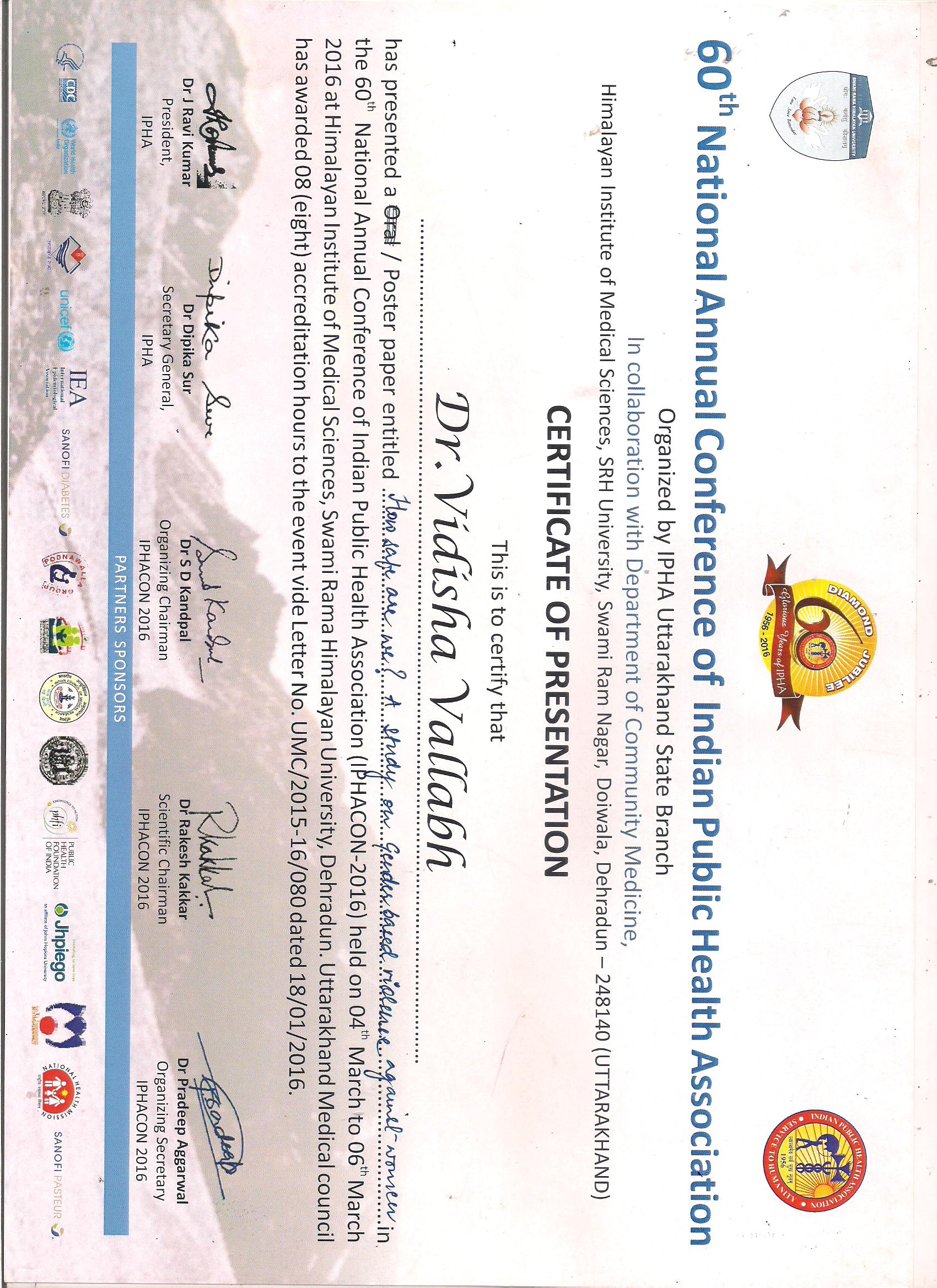 Oral paper presented on “ Morbidity and Malnutrition Profile of Under –Five Children in Rural Dehradun” at XVIII Annual conference of IAPSM UP-UK Chapter 9th -10st Oct., 2015 at BRD Medical College, Gorakhpur, UP , won gold medal for best oral paper presentation.
