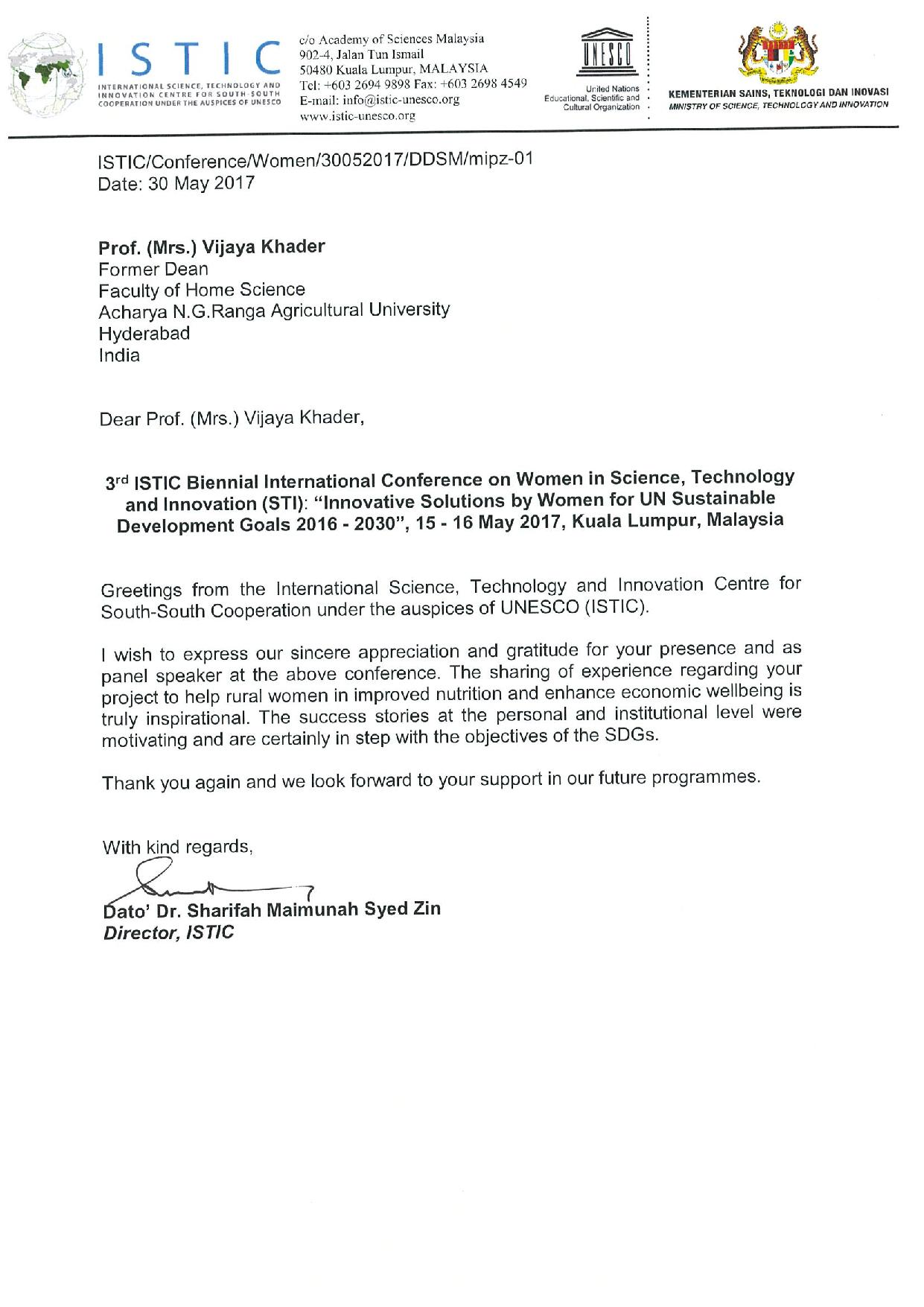 Panel Speaker ,Innovative Solutions by Women for UN sustainable Development Goals -2016-2030Organized by International Science, Technology and Innovation Centre for South- South Cooperation under the auspices of UNESCO (ISTIC)