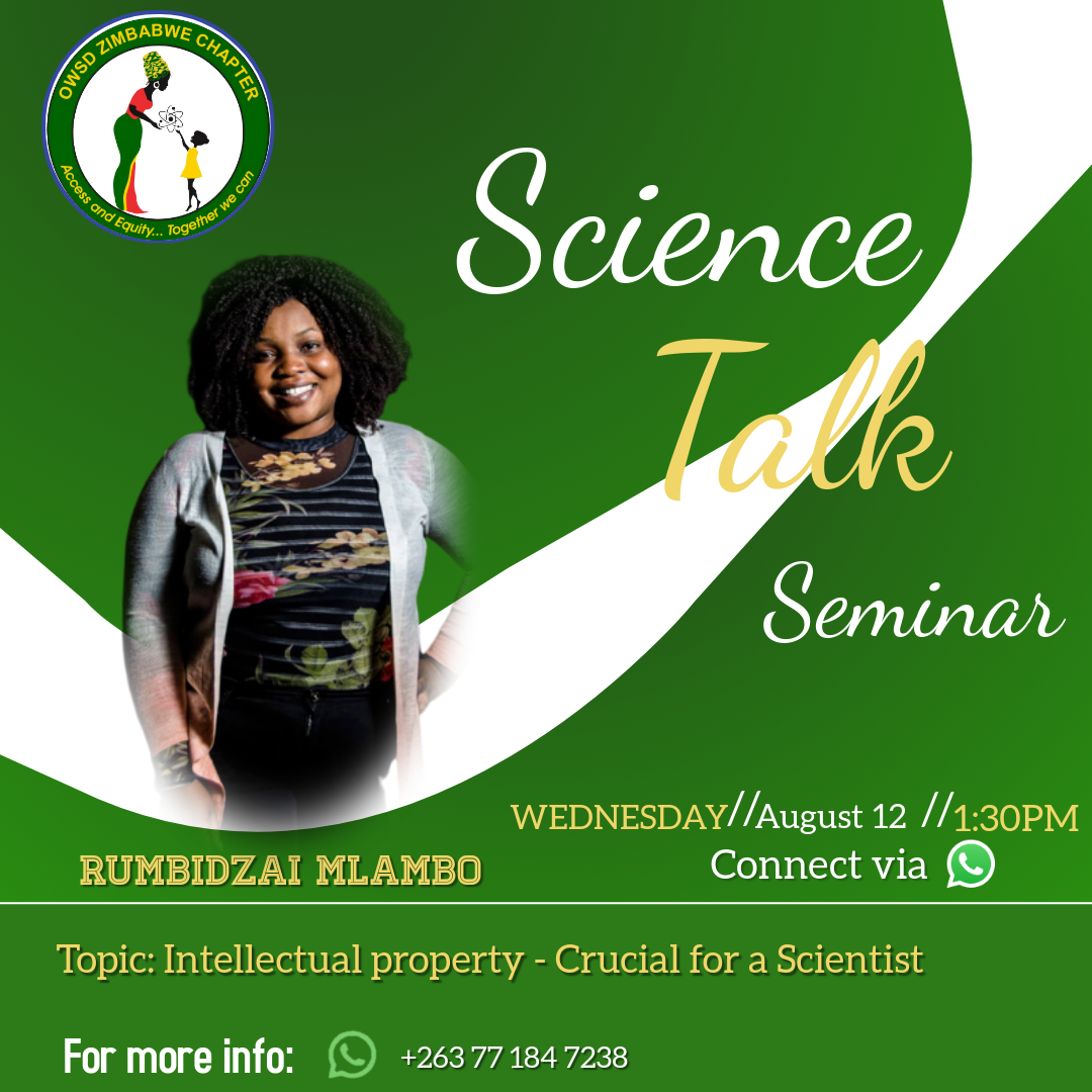 The OWSD Zimbabwe National Chapter are holding an event via WhatsApp titled "Intellectual Property: Crucial for a Scientis", featuring guest speaker Rumbidzai Mlambo. The event will take place on 12 August, starting at 13:30 Zimbabwe time.